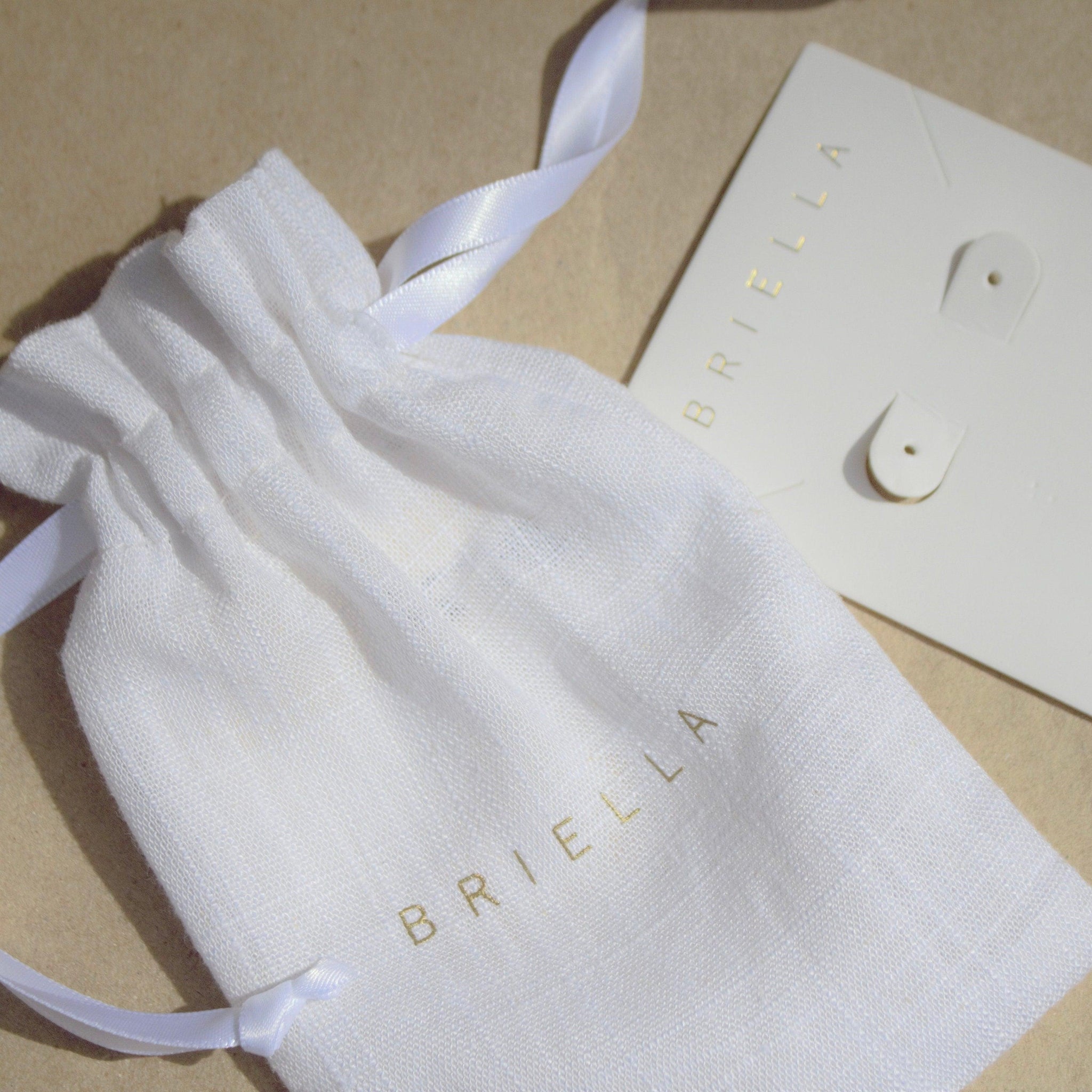 All of our jewellery comes in a Briella card inside a large and delicate white linen pouch, perfect for gifting.