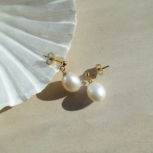 The total earring length is 0.8"/2cm, with the oval freshwater pearl measuring approximately 0.5"/1.4cm in length. These earrings are lightweight, weighing just 6g for comfortable all-day wear.